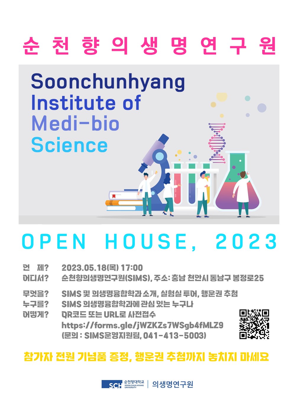 순천향의생명연구원에서 연구 및 대학원 진학에 관심이 있는 학생들을 대상으로 「2023년 순천향의생명연구원 오픈하우스」를 개최하오니 여러분들의 많은 참여를 바랍니다.